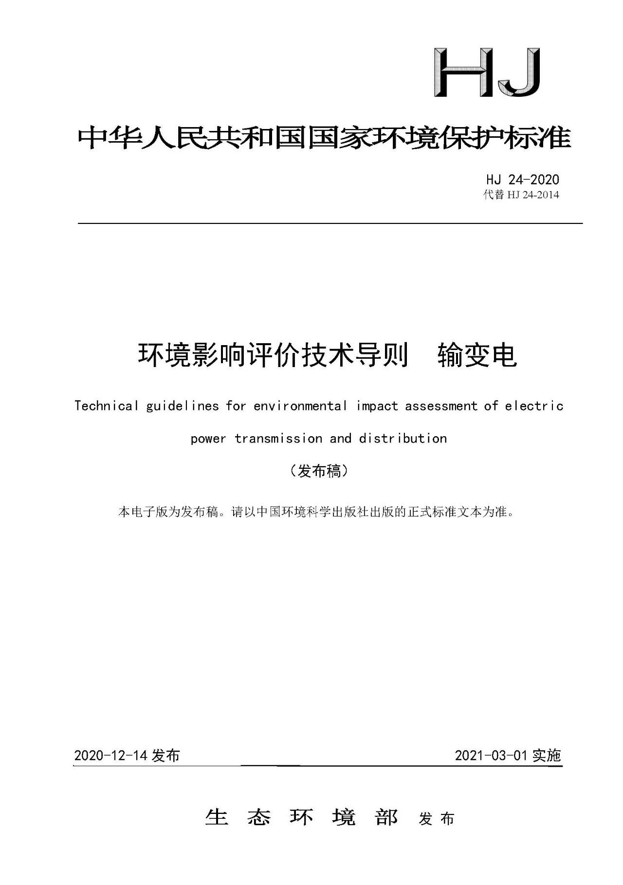 自上述標準實施之日起,《環境影響評價技術導則 輸變電工程》(HJ 24-2014)、《建設項目竣工環境保護驗收技術規范 輸變電工程》(HJ 705-2014)廢止。