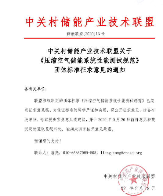 中關村儲能產業技術聯盟關于《壓縮空氣儲能系統性能測試規范》團體標準征求意見的通知